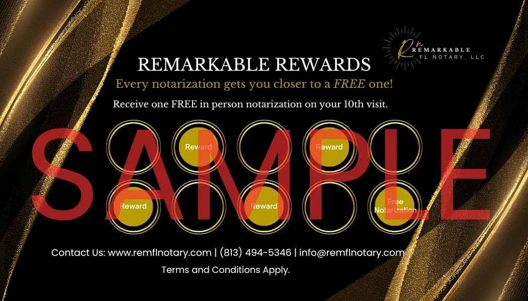 Our Remarkable Rewards program is exclusively available to clients who book and complete in-person notarization services with us. This hands-on approach allows us to personally thank you for choosing Remarkable FL Notary, LLC and ensures meaningful connection with our client community.